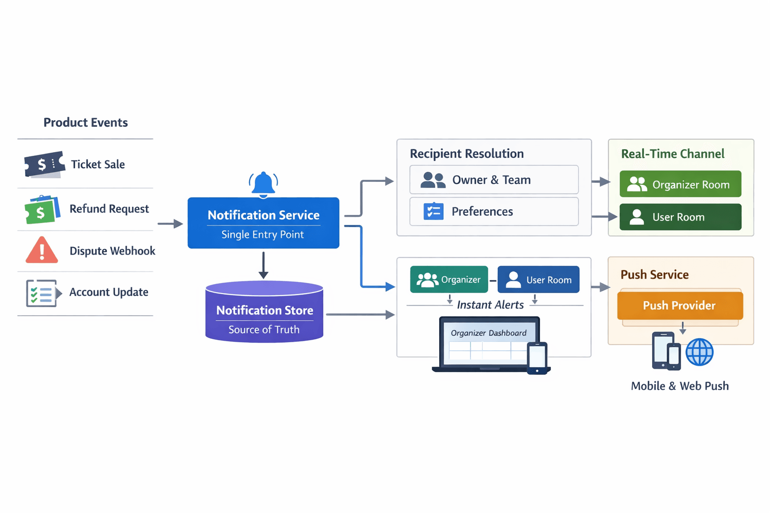 When something important happens (a new sale, a refund request, a dispute, or something the organizer needs to do like complete Stripe onboarding), we need to tell the right people. That could be the organizer who owns the account or team members who have access to sales or payments. We wanted one flow that could do three things: show the notification in the dashboard with a real-time feel, make it still there after a refresh, and send a push notification when they're not on the dashboard. We didn't want three separate systems. We wanted one "send" that handles all of it.