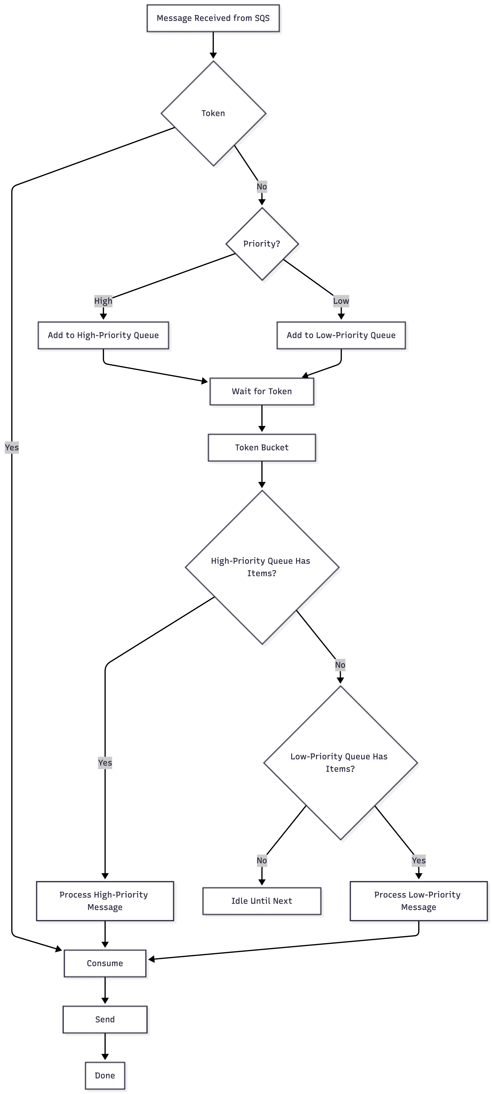 - The SQS consumer just pulls messages from SQS, then passes them to this rate-limiting layer. The layer handles when the actual send happens — respecting the token bucket. The SQS consumer just pulls messages from SQS, then passes them to this rate-limiting layer. The layer handles when the actual send happens — respecting the token bucket.